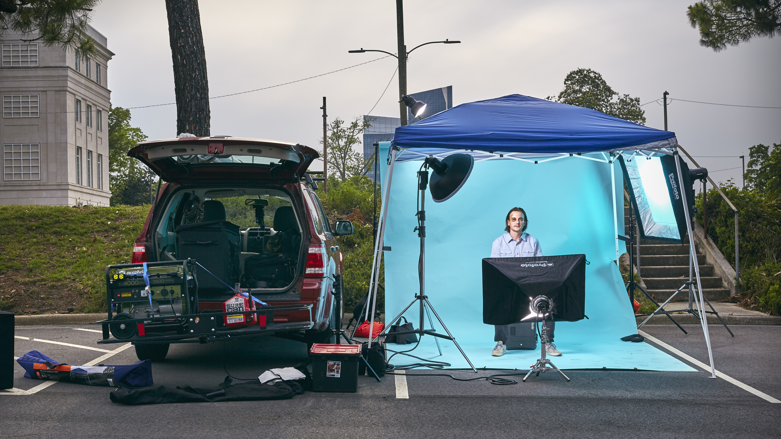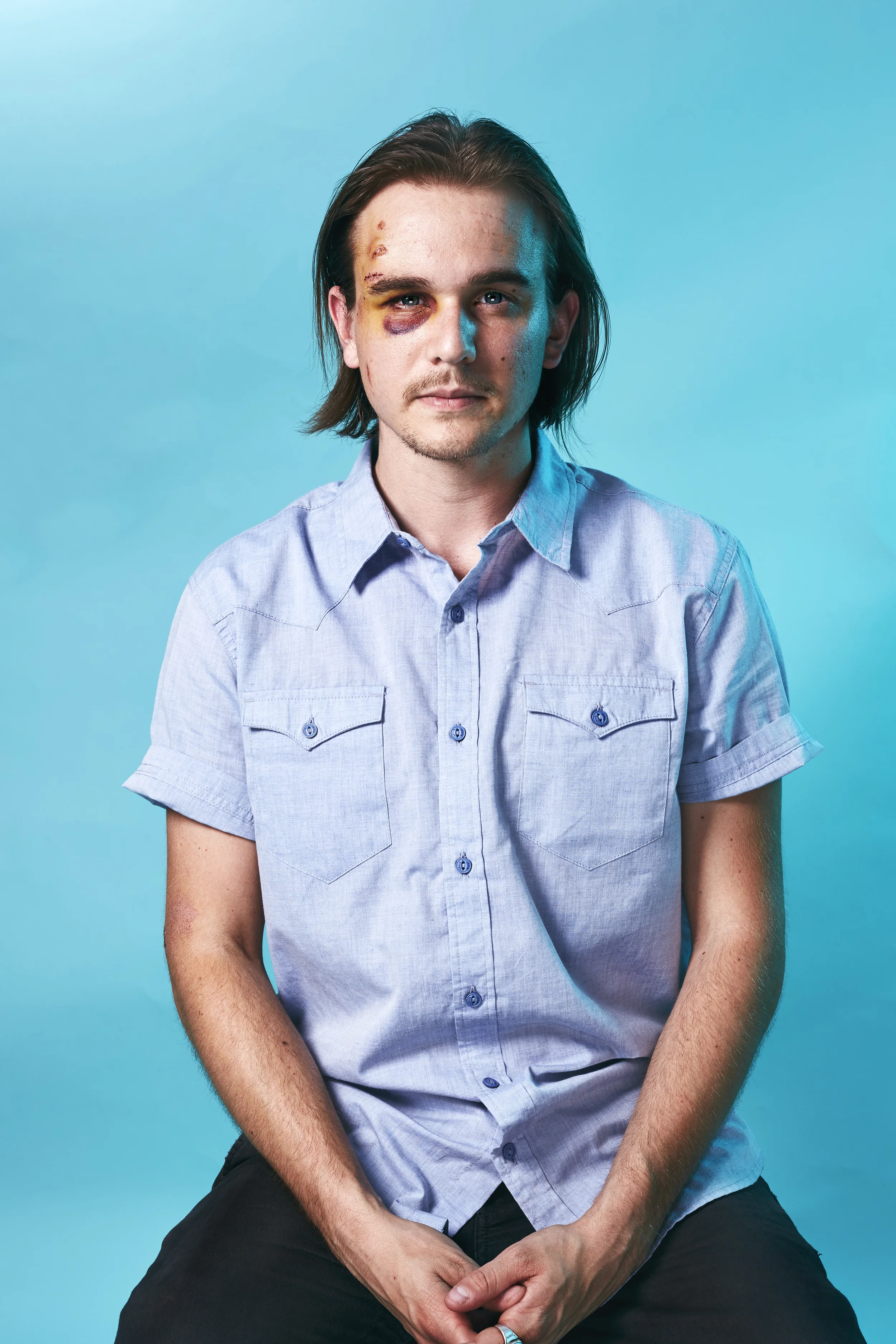 Friend and fellow photographer Ethan Messina (ethanmessina.com) recently took a dive off of his bicycle, requiring a few stitches and a good weekend of pain medication. After the stitches were removed I asked him if I could take his picture just to have something to remind us of the importance of helmets. I had an idea of what I wanted to do but did not have space available to shoot. I pulled the equipment that I have and we found an open parking lot, we set up outside and pulled power from my generator. There were a few strange looks from people getting in their cars after work as we set up but we kept our heads down and just went to work. We had a nice laugh at the situation while I photographed him, took a look at what we got and were satisfied. It was a quick takedown so we went to a bar a few blocks over to have a drink and I started working on the images. I was very happy with the results from the makeshift location studio and am always happy to hang out with Ethan.